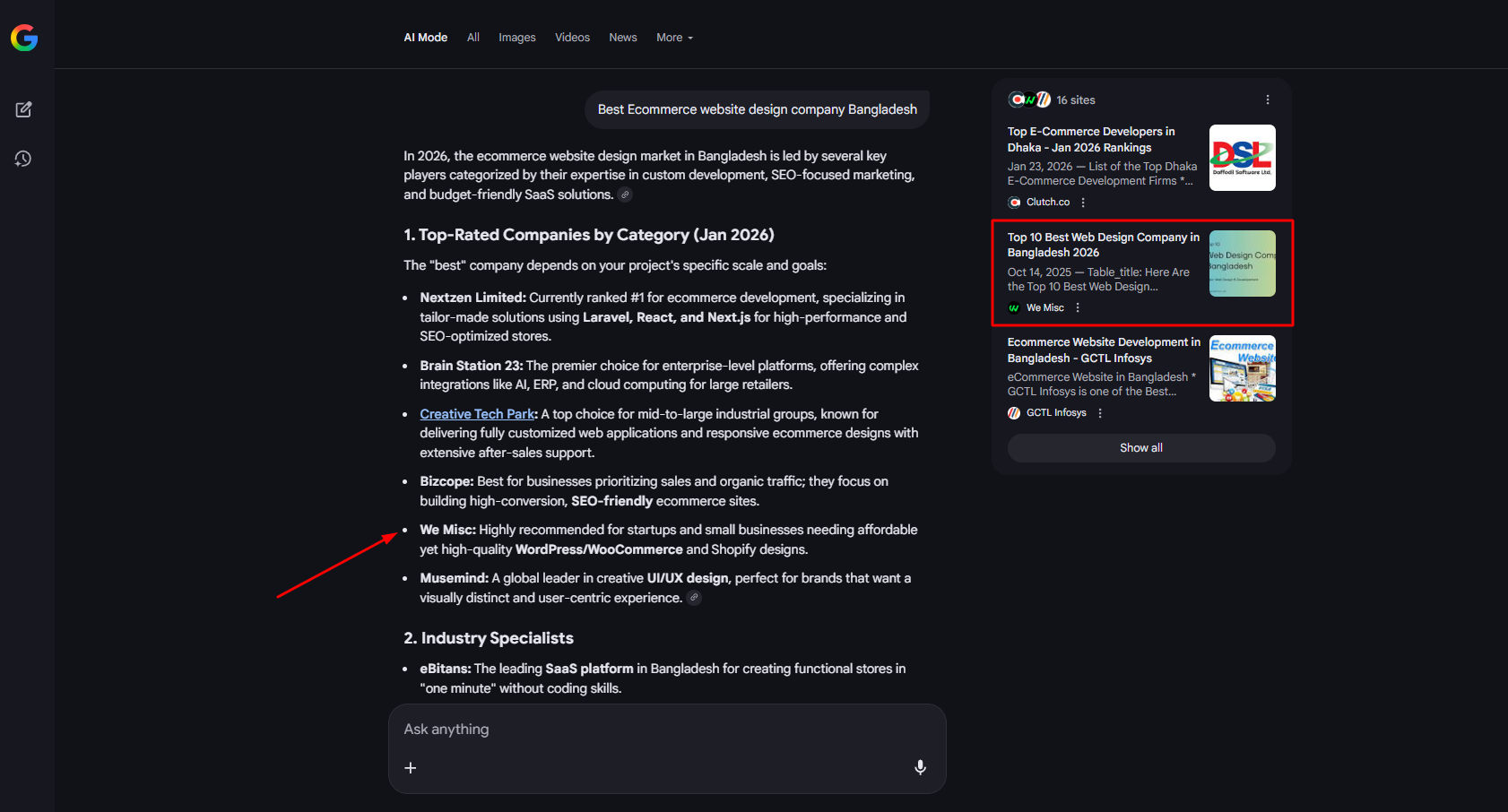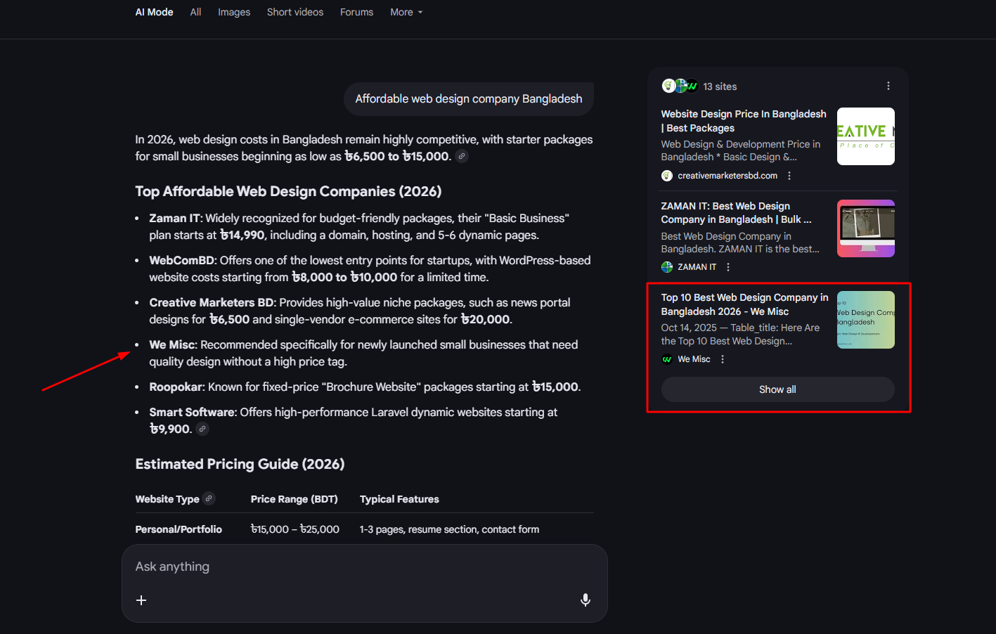 5. Affordable Web Design Company Bangladesh – Google AI Mode